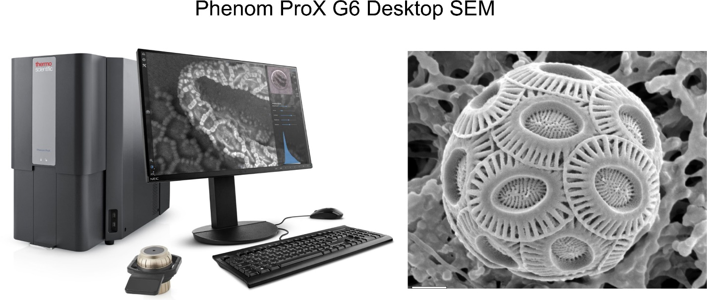 Microscopul electronic SEM (Scanning Electrone Microscope) achiziţionat (stânga) şi o imagine (dreapta) realizată cu acest SEM (alge calcaroase marine din Marea Neagră, de dimensiuni micronice).
